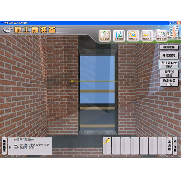 本设备依据教育部《职业教育数字校园建造设计规范》与中华人民共和国劳动和劳动安全行业标准(LD/T81.1—2006)《职业技能实验和鉴定设备通用技术规范》,教育部、人力资源和社会保障部相关专业教学大纲,为缓解电梯专业传统实验实验教学环节的不足、提升学生的职业技能水平为目的而研制。本系统以德国蒂森-克虏伯立式电梯为实物模型,就其装配与经经经典型故障排除实行拟真实验,内容含有施工准备、样板架放线、导轨装配、限速器装配、控制储物储物储物柜装配、层门装配、外呼板装配、拽引机装配、缓冲器装配、对重装配、轿厢装配、轿门装配、钢丝绳装配、故障检修1、2、3等共16个拟真实验项目,每个实验单元含有若干个实验项目,每个实验项目含有若干个经经经典型的实验步骤。